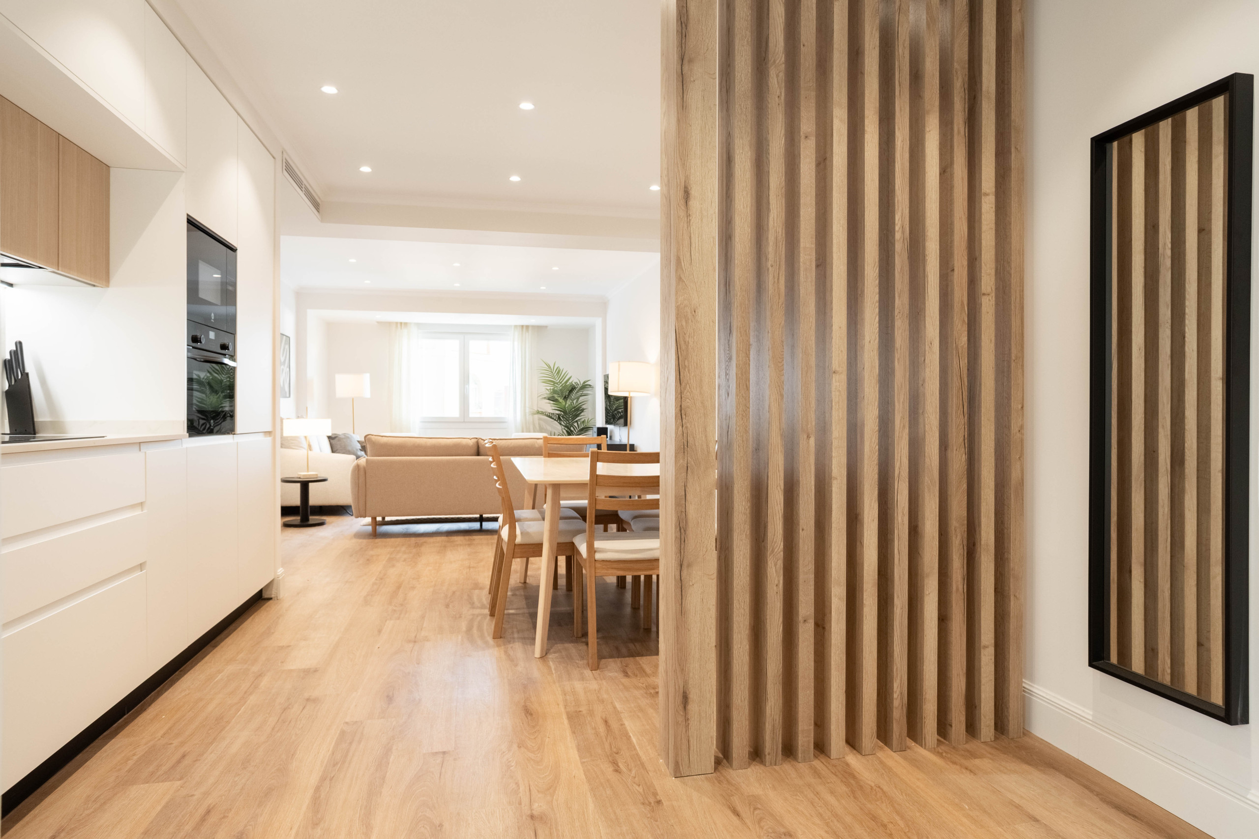 La vivienda cuenta con un amplio y luminoso salón, espacio que destaca por su diseño contemporáneo, sus generosas dimensiones y su capacidad para diferenciar distintas zonas, como área de descanso y comedor, creando un ambiente elegante y acogedor.
