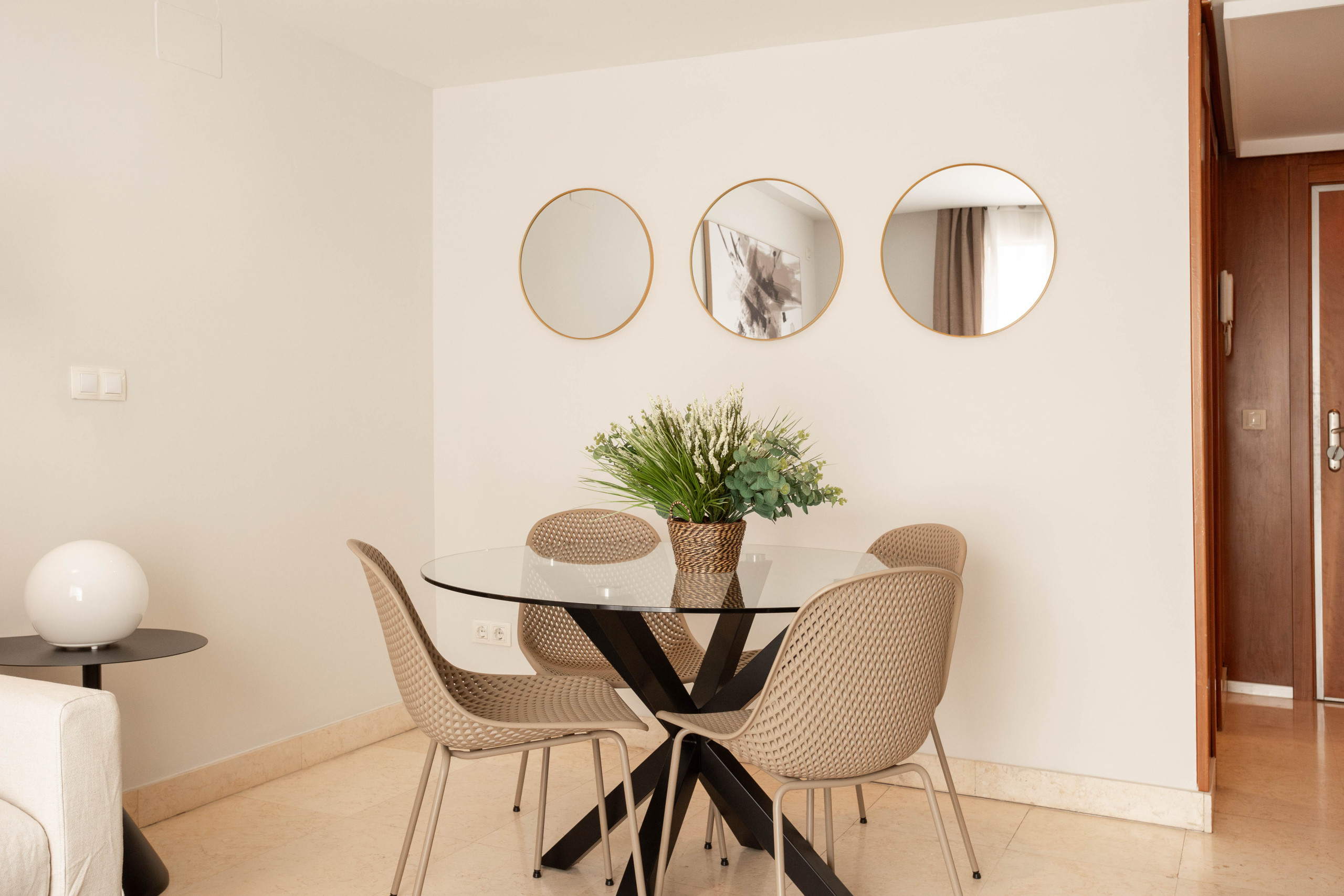 Se accede al apartamento por medio de un ancho y largo pasillo muy luminoso y bien acondicionado para ser un espacio posible de utilizar, decorado con dos pufs, mesa de apoyo, y un espejo. En este pasillo hay dos pequeños armarios empotrados muy prácticos.