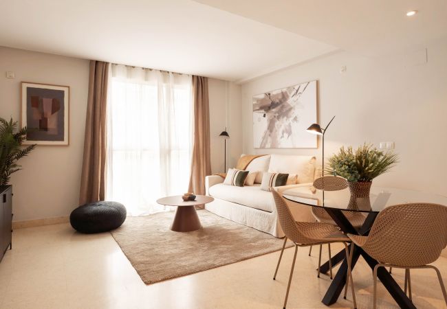 El salón destaca por su decoración contemporánea, con tonos neutros que aportan luminosidad y amplitud al espacio. Está equipado con un doble sofá cama acompañado por una mesa de centro de diseño y una alfombra que añade calidez al ambiente. La iluminación se complementa con un ventanal que llega hasta el suelo.