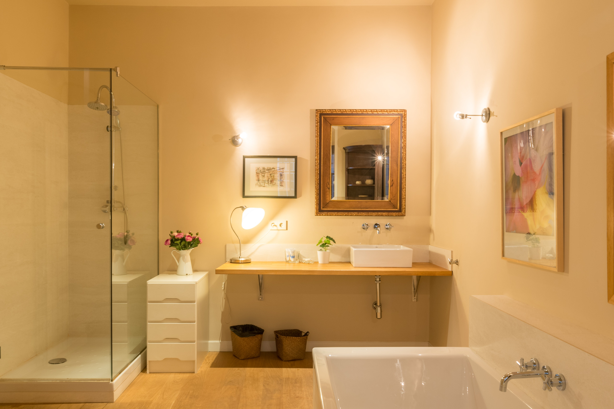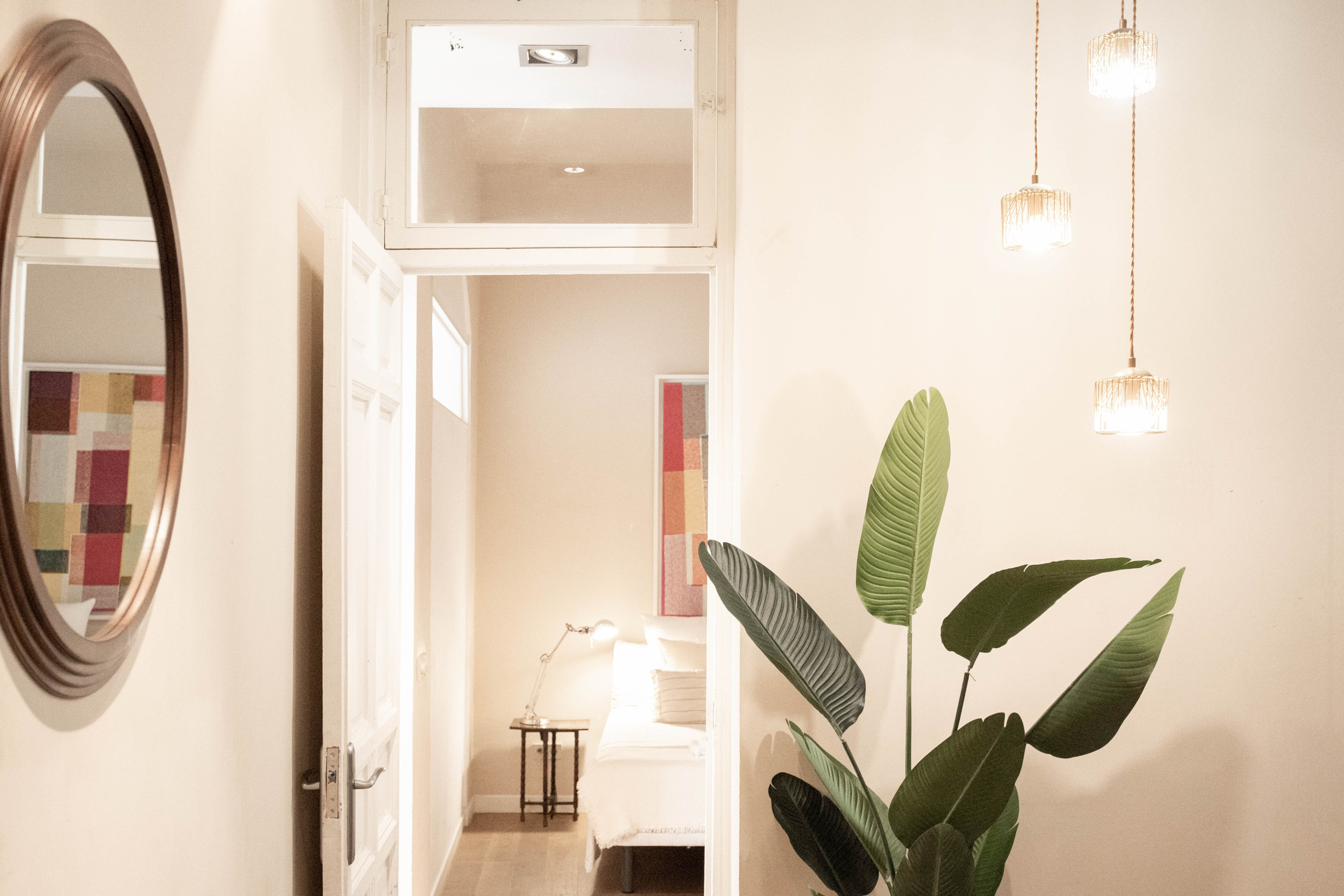 Al entrar se accede a una cocina-comedor con mucho encanto, caracterizada por una amplia mesa de comedor y unas sillas al estilo francés. A la izquierda se encuentra la primera habitación, con 2 camas individuales y un balcón a la calle. Una puerta corredera comunica esta habitación con el salón, un gran espacio luminoso con sofá, chaise longue y puf para el descanso de todos los huéspedes. La segunda habitación dispone de una cama doble, la principal cuenta con cama matrimonial y tiene acceso a un gran vestidor y a un espectacular cuarto de baño con ducha y bañera independiente (el baño también es accesible desde el salón).