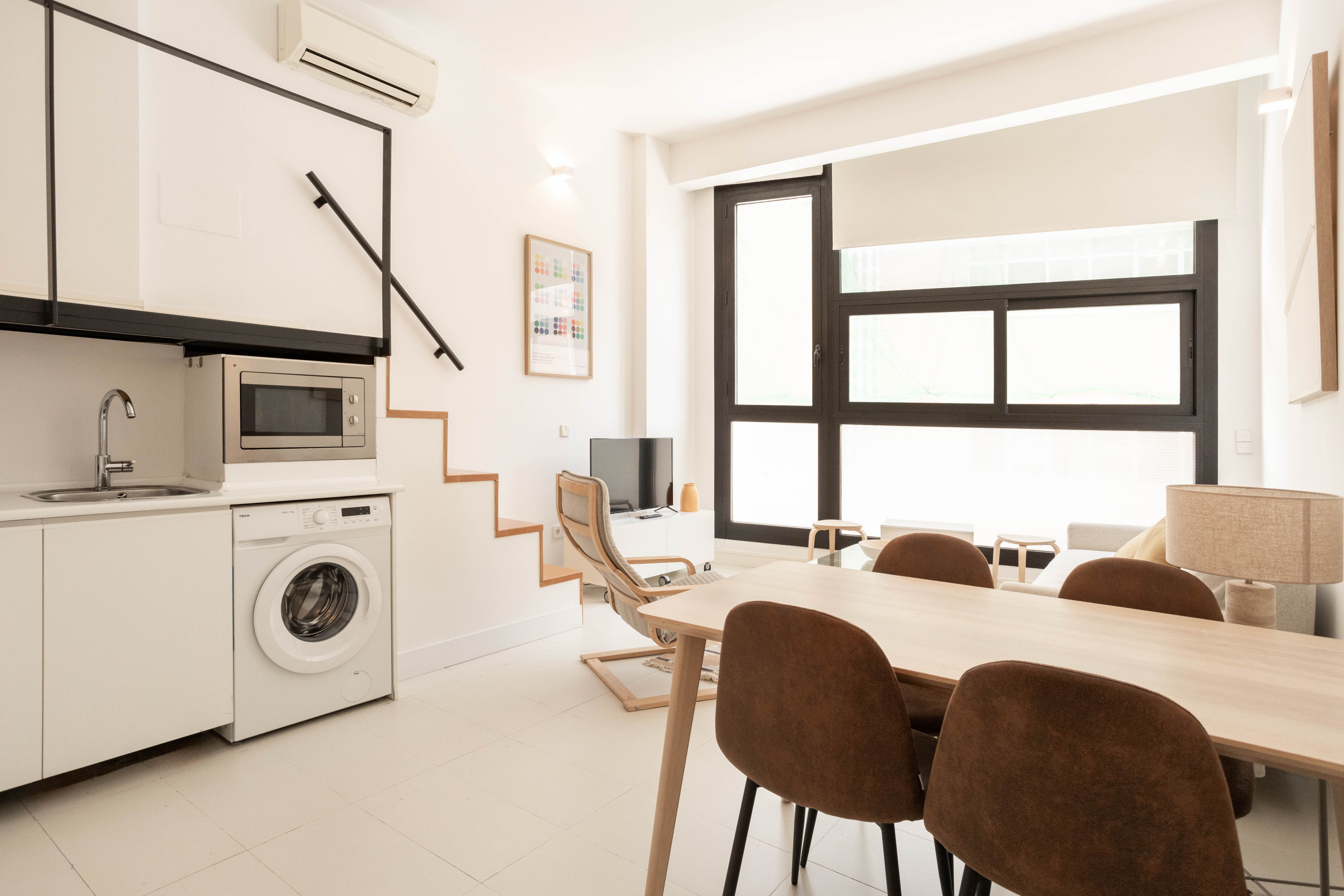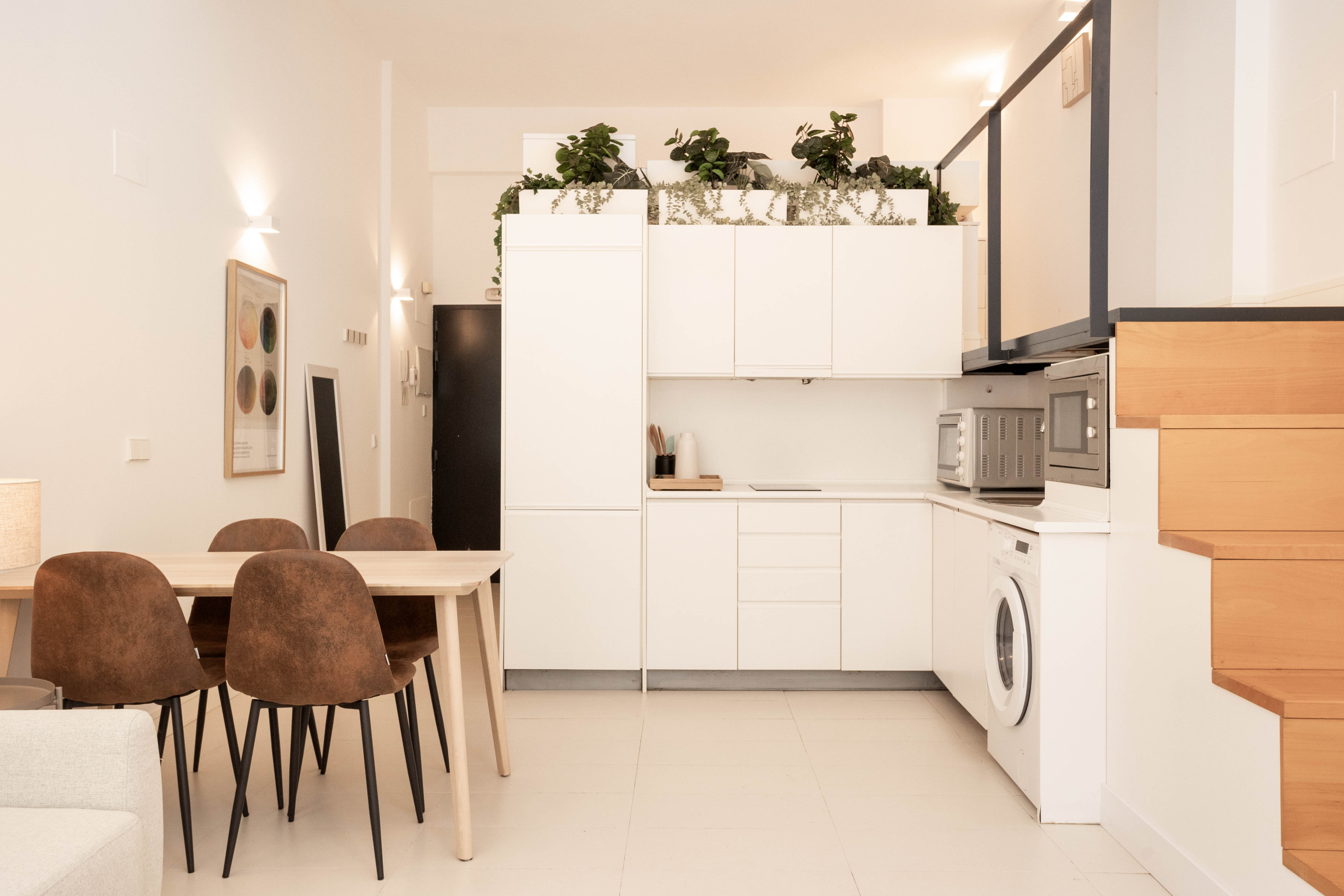 La planta inferior integra el salón y la cocina, otorgando confort y practicidad al espacio. El salón cuenta con un Smart tv, una elegante mesa de comedor y un cómodo sofá-cama con capacidad para dos personas. También en esta planta se ubica el baño con ducha