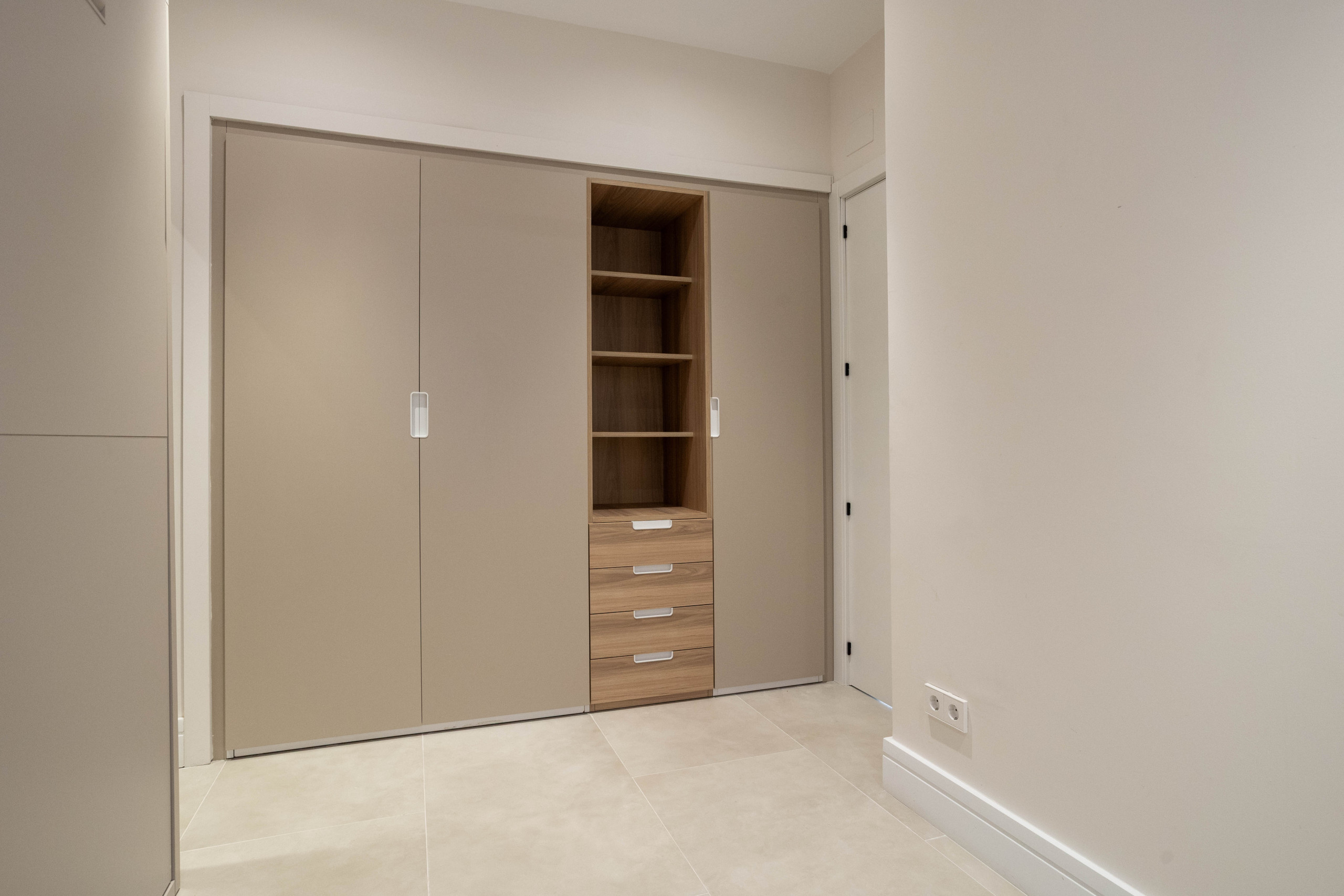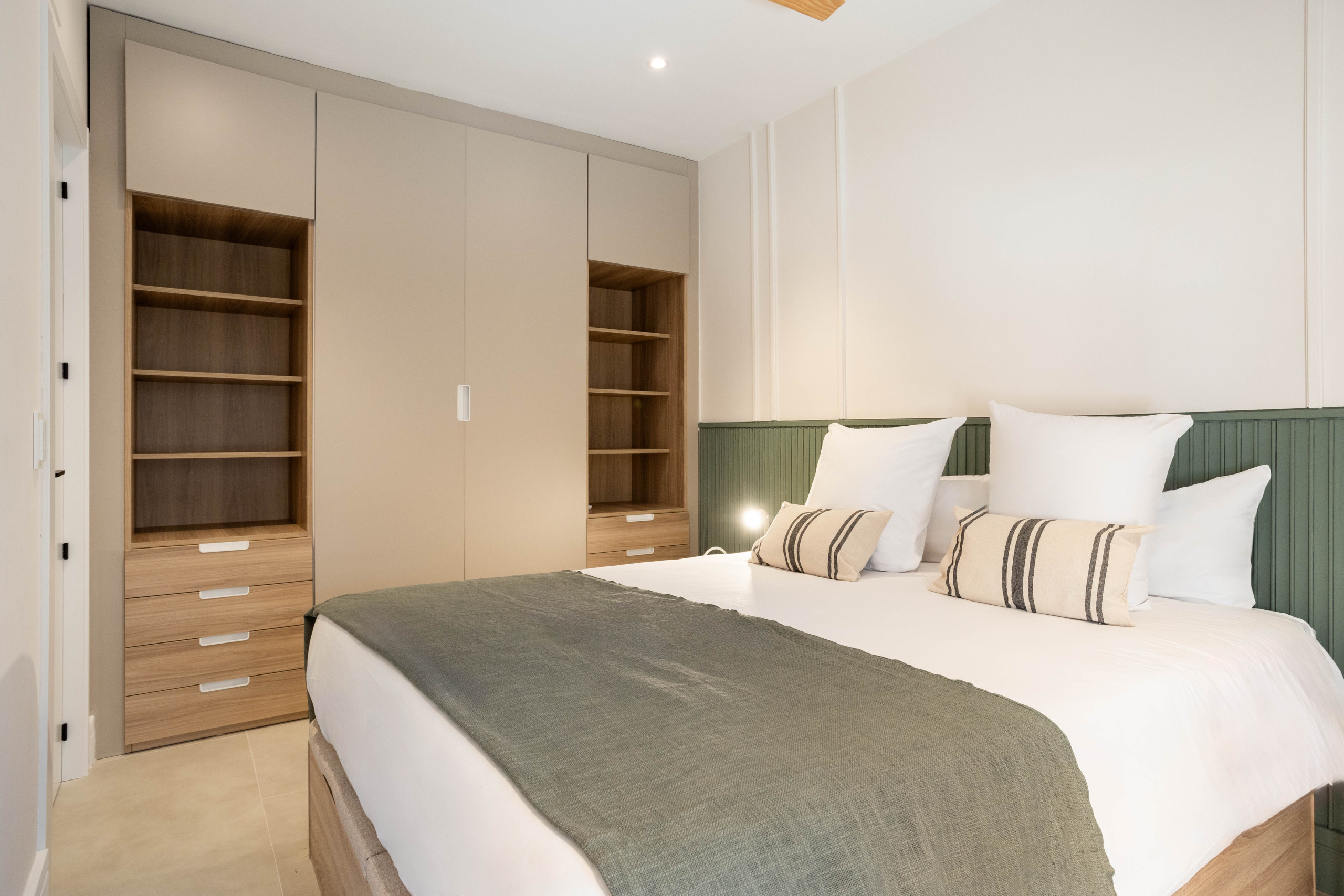 Regarding the bedrooms, the main one is designed for rest with a comfortable and welcoming layout. The second bedroom stands out for its functional solution: the bed is integrated into a wardrobe and can be easily deployed when needed, allowing maximum space utilisation when not in use. This makes it a versatile room, ideal as an additional bedroom, office or multi-functional area.