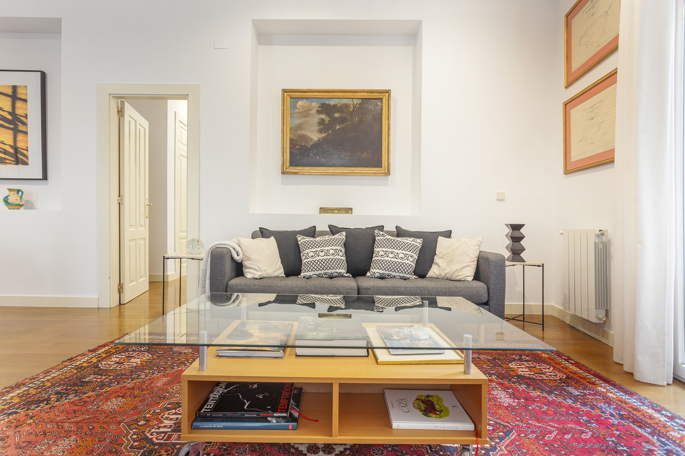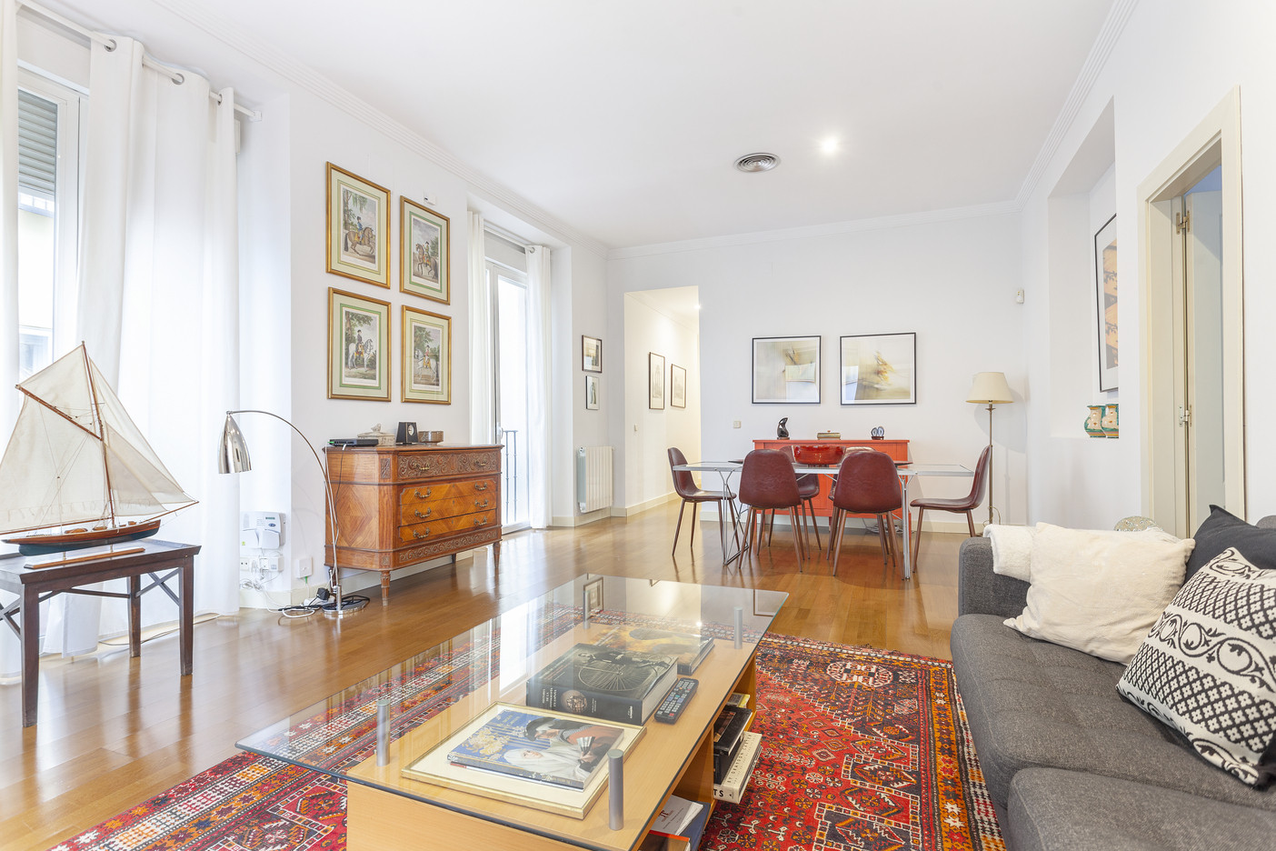 Located in a typical renovated Madrid building. A spacious 120 m2 apartment built and decorated with the best finishes, good insulating windows, quality wooden floors and every detail in furniture: rugs, curtains and classic style paintings, all in perfect condition.