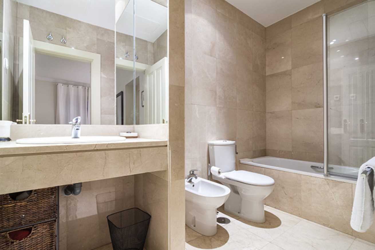 The bathrooms are fantastic, renovated with marble, one with a shower and another en-suite in the main bedroom, with a bathtub. The kitchen is super spacious and comfortable and is phenomenally equipped. The apartment has a terrace overlooking a large interior courtyard (about 20 m2) which has been fitted with awnings, tables and chairs for use. An addition that makes this apartment the perfect choice.